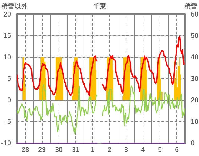 | 日 | 時 | 気温 | 降水 | 風向/風速 | 日照 | 積雪 | 降雪 |