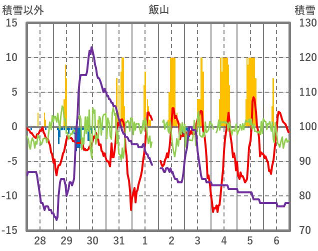 | 日 | 時 | 気温 | 降水 | 風向/風速 | 日照 | 積雪 | 降雪 |