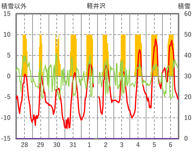 | 日 | 時 | 気温 | 降水 | 風向/風速 | 日照 | 積雪 | 降雪 |