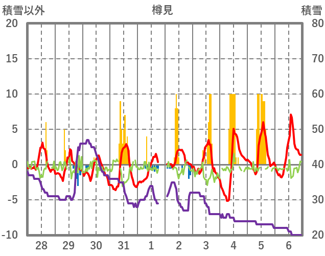 | 日 | 時 | 気温 | 降水 | 風向/風速 | 日照 | 積雪 | 降雪 |