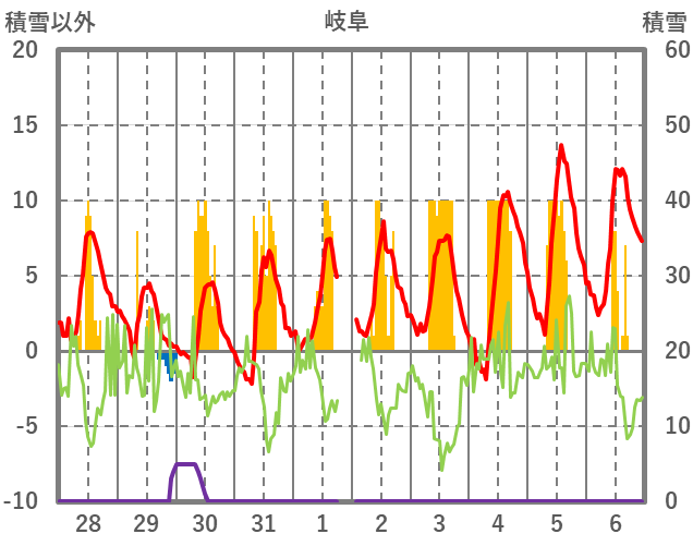 | 日 | 時 | 気温 | 降水 | 風向/風速 | 日照 | 積雪 | 降雪 |