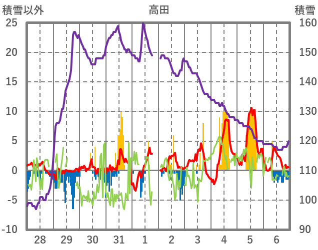 | 日 | 時 | 気温 | 降水 | 風向/風速 | 日照 | 積雪 | 降雪 |