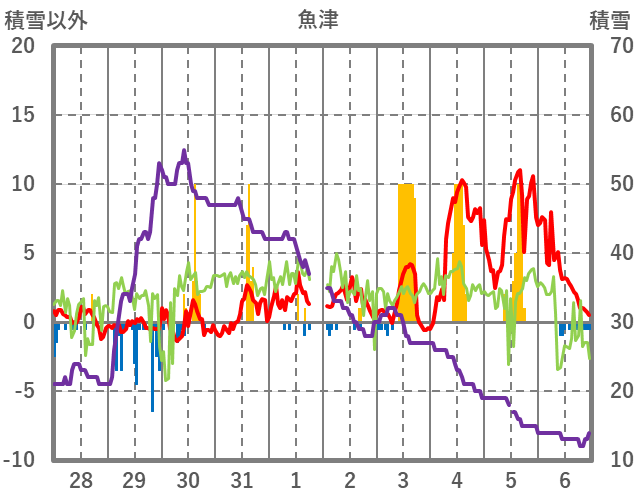 | 日 | 時 | 気温 | 降水 | 風向/風速 | 日照 | 積雪 | 降雪 |