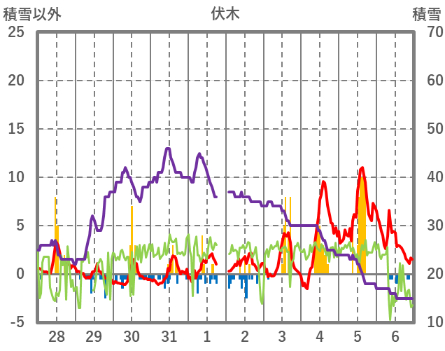 | 日 | 時 | 気温 | 降水 | 風向/風速 | 日照 | 積雪 | 降雪 |