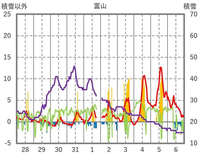 | 日 | 時 | 気温 | 降水 | 風向/風速 | 日照 | 積雪 | 降雪 |