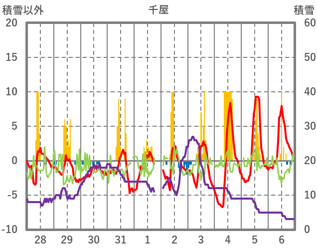 | 日 | 時 | 気温 | 降水 | 風向/風速 | 日照 | 積雪 | 降雪 |