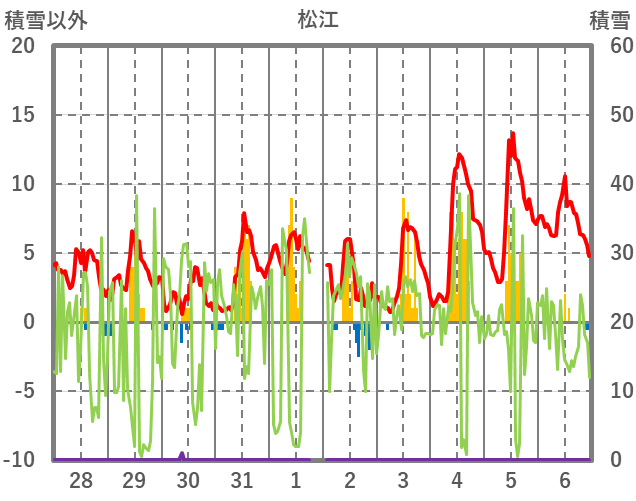 | 日 | 時 | 気温 | 降水 | 風向/風速 | 日照 | 積雪 | 降雪 |