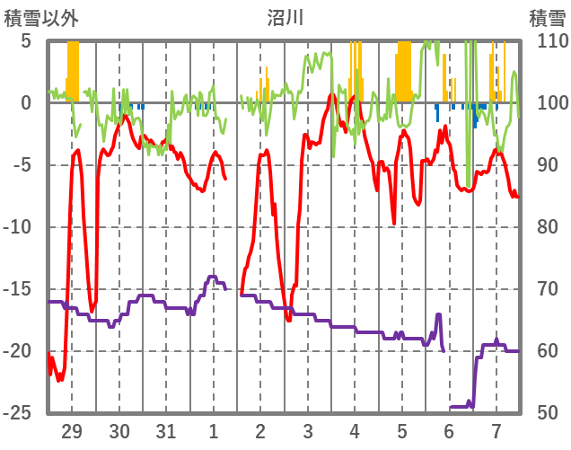 | 日 | 時 | 気温 | 降水 | 風向/風速 | 日照 | 積雪 | 降雪 |