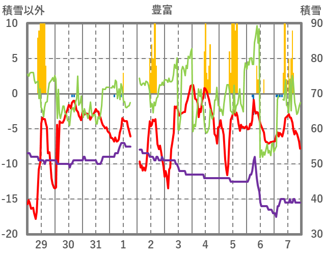 | 日 | 時 | 気温 | 降水 | 風向/風速 | 日照 | 積雪 | 降雪 |
