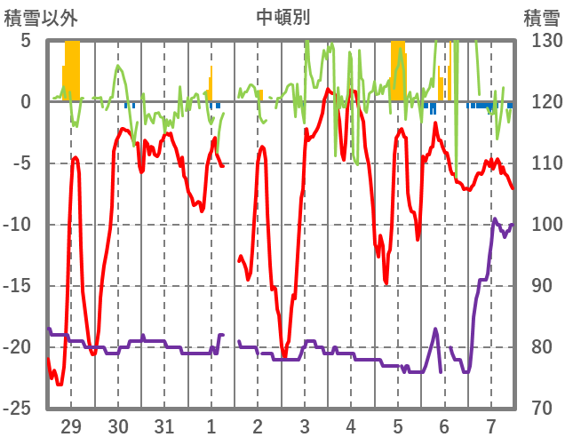 | 日 | 時 | 気温 | 降水 | 風向/風速 | 日照 | 積雪 | 降雪 |