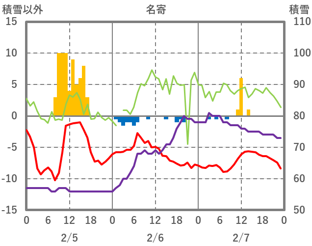 | 日 | 時 | 気温 | 降水 | 風向/風速 | 日照 | 積雪 | 降雪 |