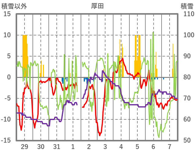 | 日 | 時 | 気温 | 降水 | 風向/風速 | 日照 | 積雪 | 降雪 |