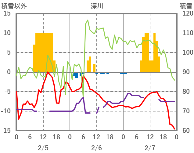 | 日 | 時 | 気温 | 降水 | 風向/風速 | 日照 | 積雪 | 降雪 |