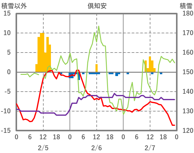 | 日 | 時 | 気温 | 降水 | 風向/風速 | 日照 | 積雪 | 降雪 |