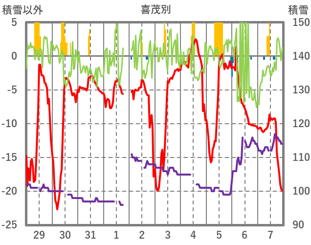 | 日 | 時 | 気温 | 降水 | 風向/風速 | 日照 | 積雪 | 降雪 |