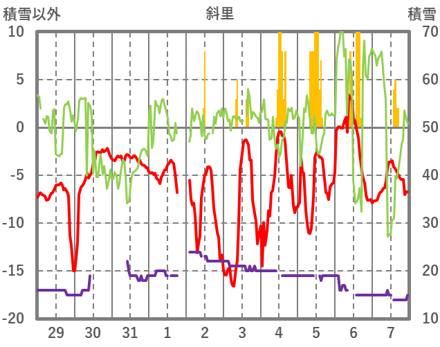 | 日 | 時 | 気温 | 降水 | 風向/風速 | 日照 | 積雪 | 降雪 |