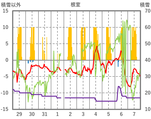 | 日 | 時 | 気温 | 降水 | 風向/風速 | 日照 | 積雪 | 降雪 |