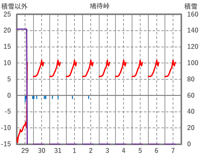 | 日 | 時 | 気温 | 降水 | 風向/風速 | 日照 | 積雪 | 降雪 |