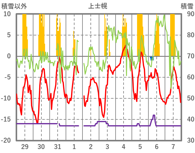 | 日 | 時 | 気温 | 降水 | 風向/風速 | 日照 | 積雪 | 降雪 |