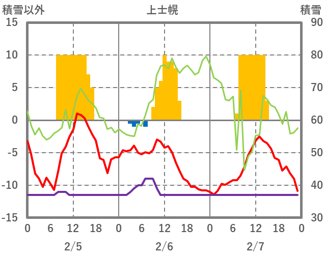 | 日 | 時 | 気温 | 降水 | 風向/風速 | 日照 | 積雪 | 降雪 |