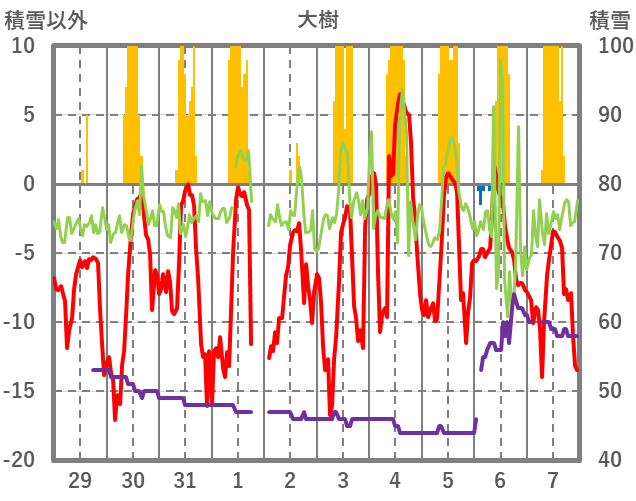 | 日 | 時 | 気温 | 降水 | 風向/風速 | 日照 | 積雪 | 降雪 |