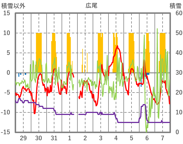 | 日 | 時 | 気温 | 降水 | 風向/風速 | 日照 | 積雪 | 降雪 |