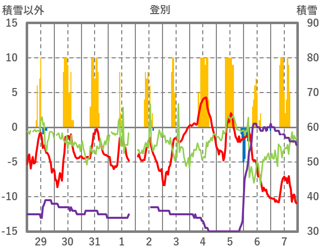 | 日 | 時 | 気温 | 降水 | 風向/風速 | 日照 | 積雪 | 降雪 |