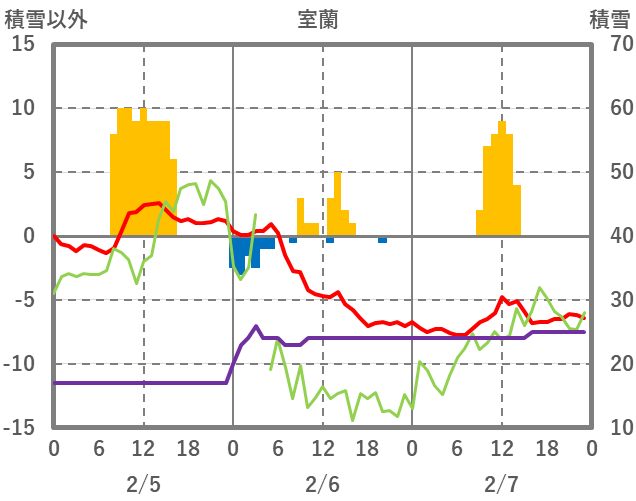 | 日 | 時 | 気温 | 降水 | 風向/風速 | 日照 | 積雪 | 降雪 |