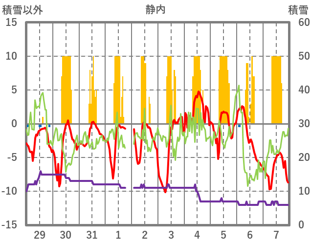 | 日 | 時 | 気温 | 降水 | 風向/風速 | 日照 | 積雪 | 降雪 |