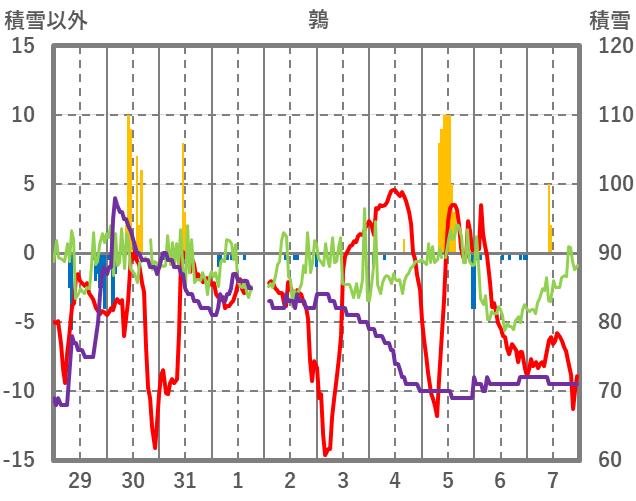 | 日 | 時 | 気温 | 降水 | 風向/風速 | 日照 | 積雪 | 降雪 |