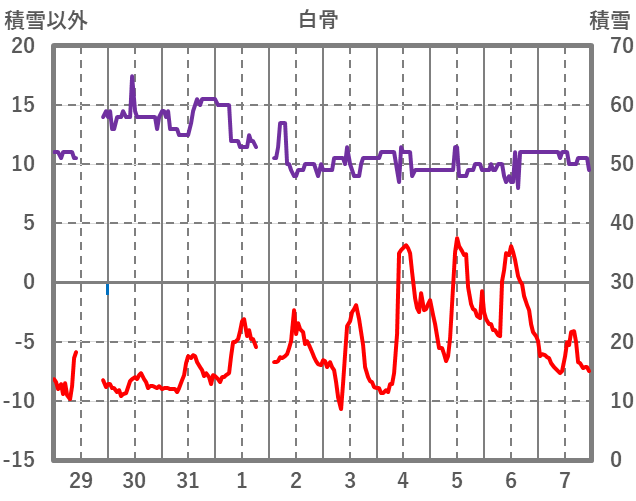 | 日 | 時 | 気温 | 降水 | 風向/風速 | 日照 | 積雪 | 降雪 |
