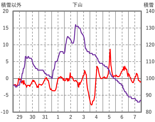 | 日 | 時 | 気温 | 降水 | 風向/風速 | 日照 | 積雪 | 降雪 |