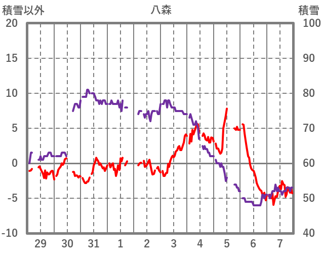 | 日 | 時 | 気温 | 降水 | 風向/風速 | 日照 | 積雪 | 降雪 |