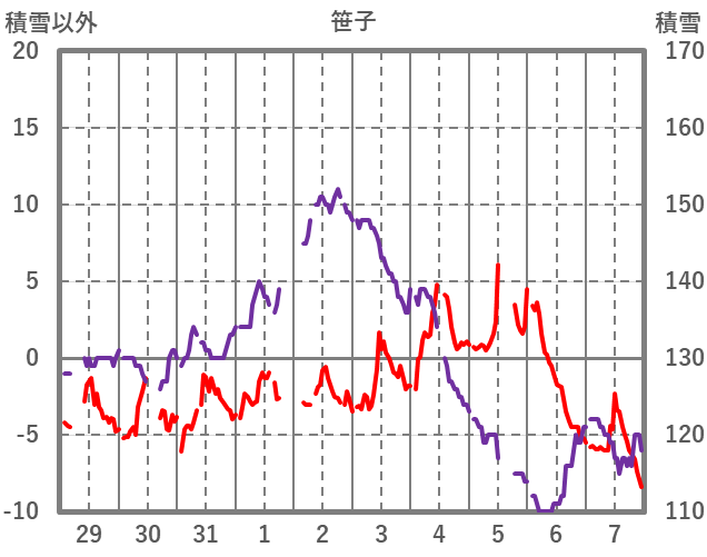 | 日 | 時 | 気温 | 降水 | 風向/風速 | 日照 | 積雪 | 降雪 |