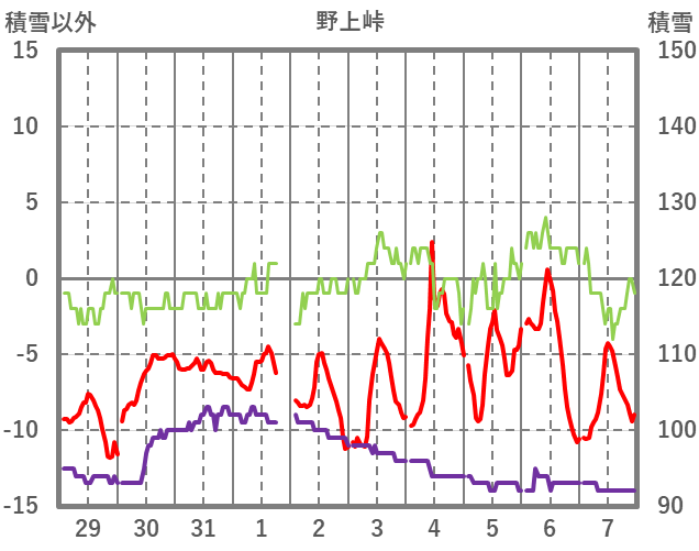 | 日 | 時 | 気温 | 降水 | 風向/風速 | 日照 | 積雪 | 降雪 |