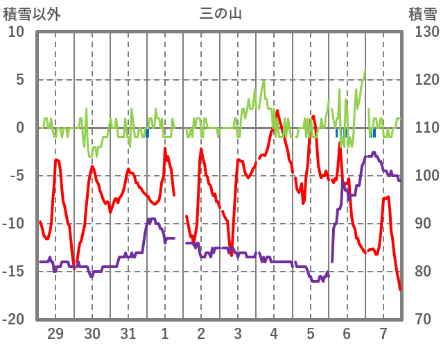 | 日 | 時 | 気温 | 降水 | 風向/風速 | 日照 | 積雪 | 降雪 |