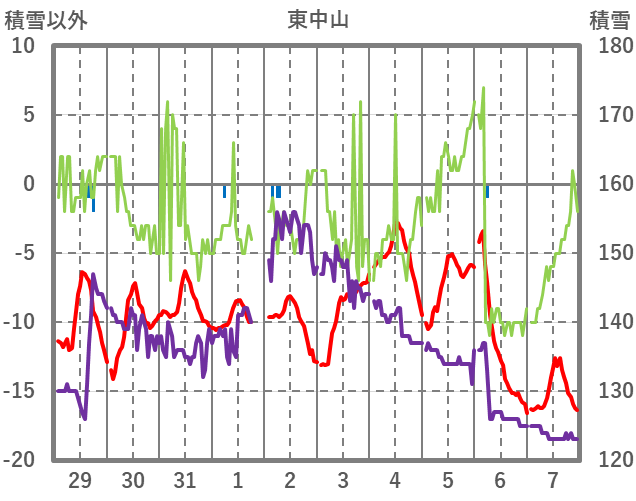 | 日 | 時 | 気温 | 降水 | 風向/風速 | 日照 | 積雪 | 降雪 |