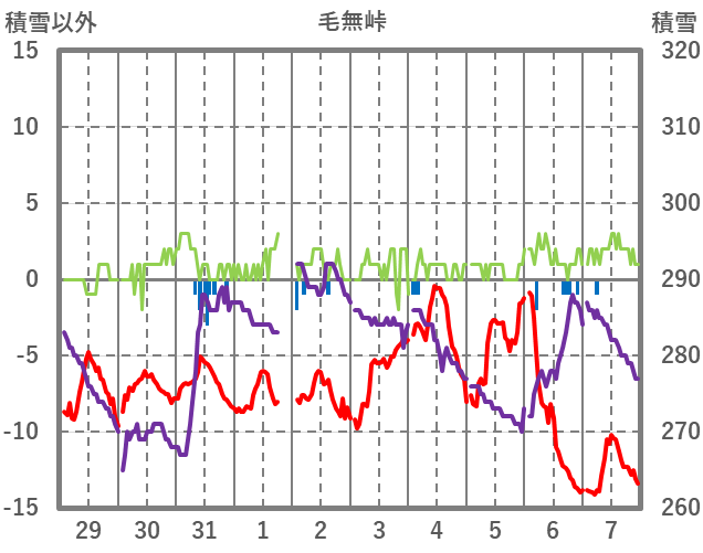 | 日 | 時 | 気温 | 降水 | 風向/風速 | 日照 | 積雪 | 降雪 |
