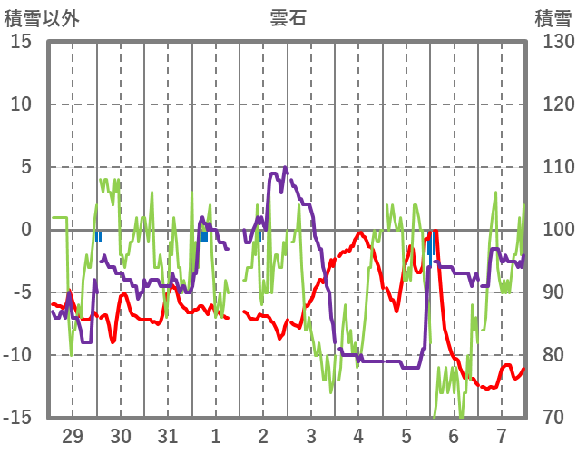 | 日 | 時 | 気温 | 降水 | 風向/風速 | 日照 | 積雪 | 降雪 |