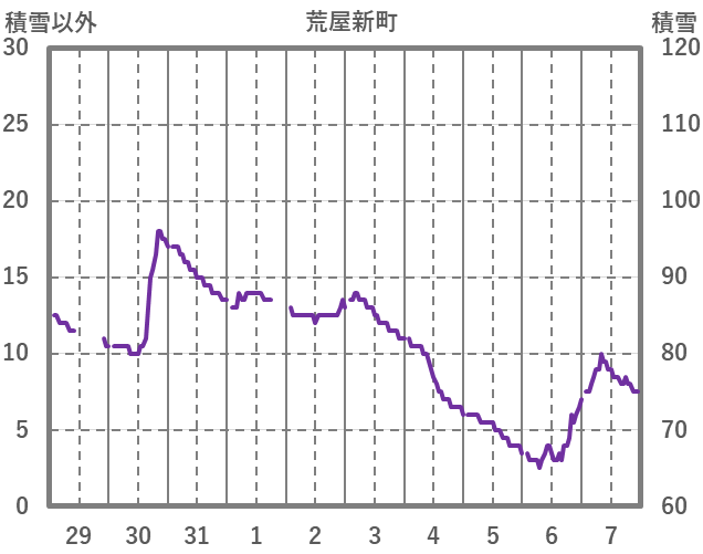 | 日 | 時 | 気温 | 降水 | 風向/風速 | 日照 | 積雪 | 降雪 |
