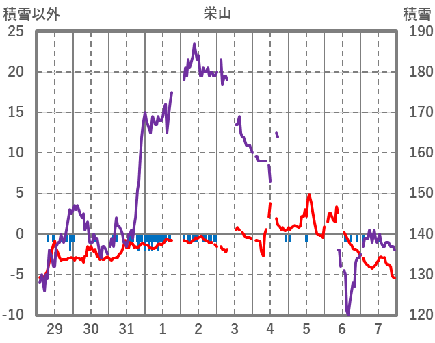 | 日 | 時 | 気温 | 降水 | 風向/風速 | 日照 | 積雪 | 降雪 |