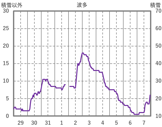 | 日 | 時 | 気温 | 降水 | 風向/風速 | 日照 | 積雪 | 降雪 |