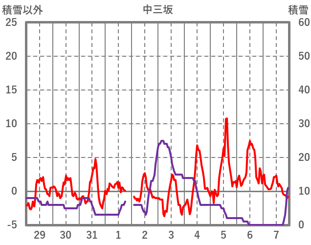 | 日 | 時 | 気温 | 降水 | 風向/風速 | 日照 | 積雪 | 降雪 |