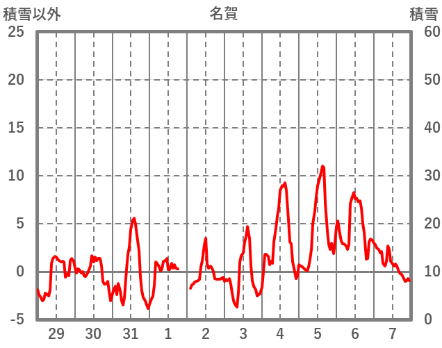 | 日 | 時 | 気温 | 降水 | 風向/風速 | 日照 | 積雪 | 降雪 |