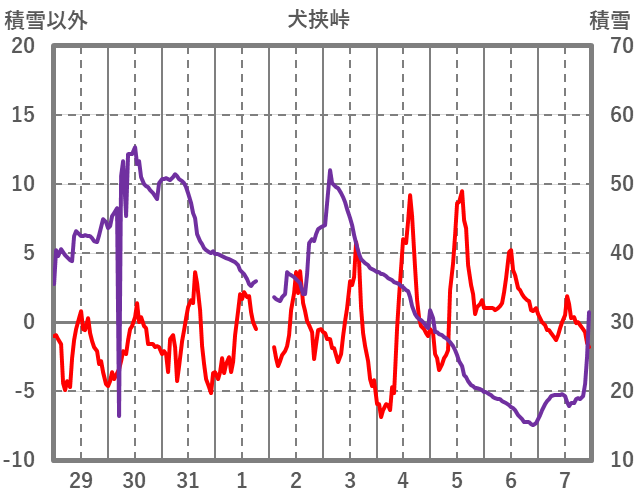 | 日 | 時 | 気温 | 降水 | 風向/風速 | 日照 | 積雪 | 降雪 |