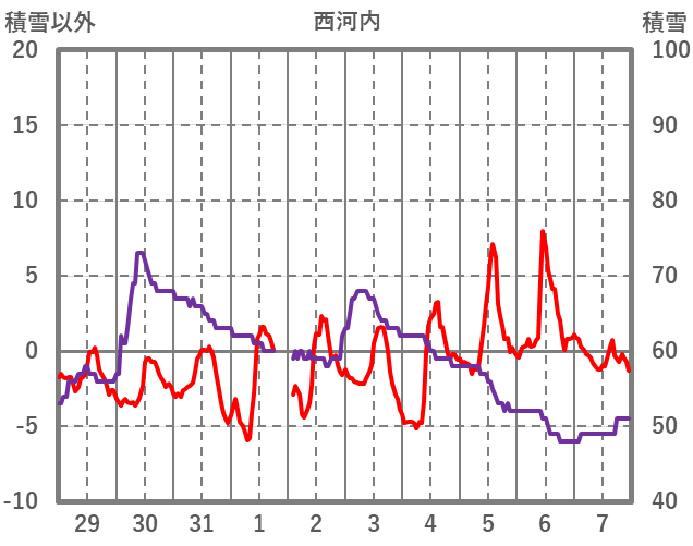 | 日 | 時 | 気温 | 降水 | 風向/風速 | 日照 | 積雪 | 降雪 |