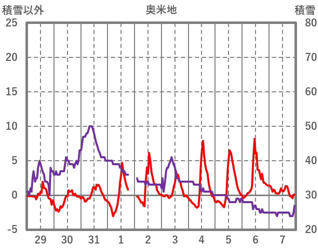 | 日 | 時 | 気温 | 降水 | 風向/風速 | 日照 | 積雪 | 降雪 |