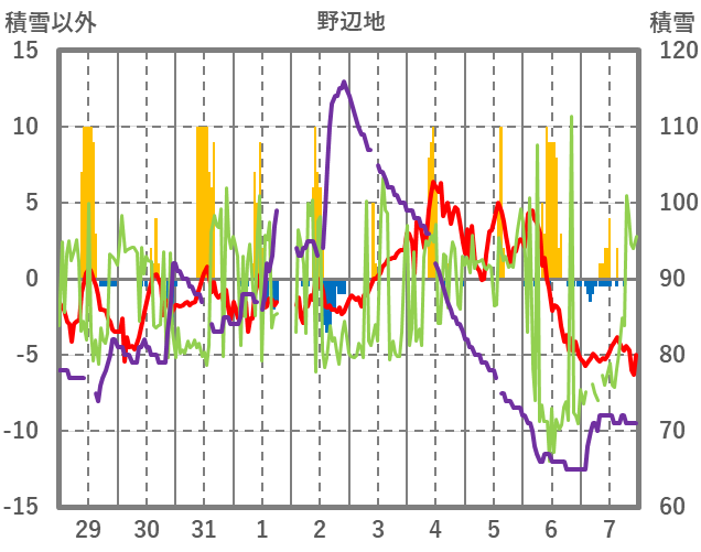 | 日 | 時 | 気温 | 降水 | 風向/風速 | 日照 | 積雪 | 降雪 |