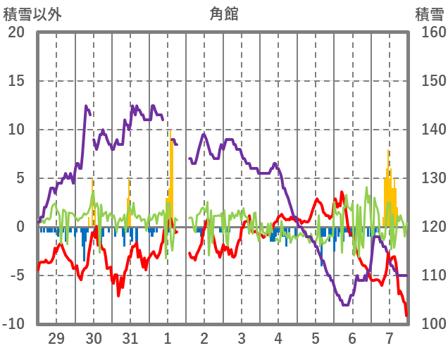 | 日 | 時 | 気温 | 降水 | 風向/風速 | 日照 | 積雪 | 降雪 |