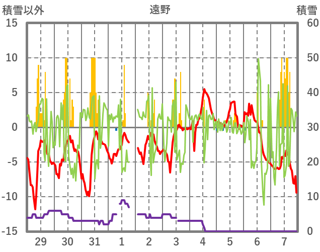 | 日 | 時 | 気温 | 降水 | 風向/風速 | 日照 | 積雪 | 降雪 |